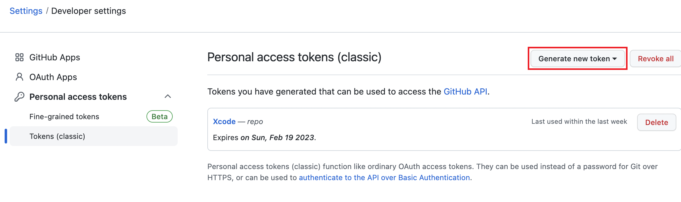 Generate new token (classic) 선택